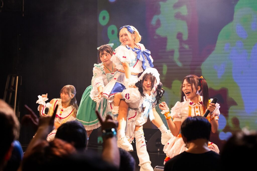 ライブでお馴染みの『ナカザワールドカオス』が飛びだしたとたん、場内のあちこちから、彼女らに向けて熱いかけ声が張り上がる。風を切って駆ける楽曲に乗せ、小ばぁびゐが自転車になって愛妹みいを乗せて走る場面も登場。5人のポジティブでハイテンションなパワーが、この会場を熱狂したカオスな空間に染め上げていった。