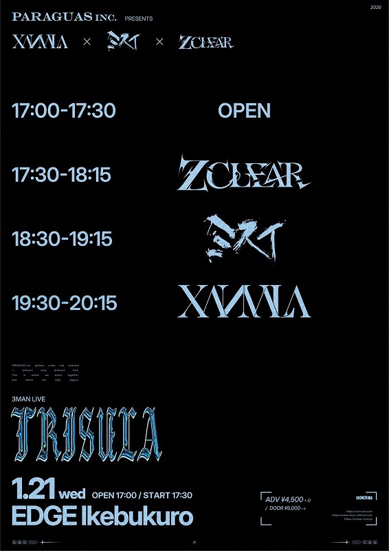 「PARAGUAS inc.」に所属しているXANVALA/ミスイ/Z CLEARが一堂に会す、レーベルとして初となるイベント3MAN LIVE「TRISULA」が、1月21日(水)に池袋EDGEで行われる。チケットは残り僅か。このチャンスを逃さずに見てほしい。